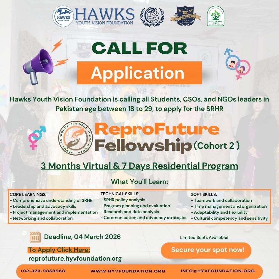 HAWKS YOUTH VISION FOUNDATION is a not-for-profit Youth registered organization. We are bringing together thousands of youth groups from across the Pakistan for their capacity building and betterment of Pakistan. Hawks Youth Vision Foundation is pleased to announce the ReproFuture Fellowship, a transformative opportunity for young leaders to advance Sexual and Reproductive Health and Rights (SRHR) in their communities. The fellowship aims to equip young people with the knowledge, skills, and networks necessary to become effective SRHR advocates and change-makers. The Reprofuture Fellowship Program is a comprehensive initiative designed to empower young individuals to become effective advocates for sexual and reproductive health and rights (SRHR) in Pakistan. The program aims to address the pressing issues of SRHR in Pakistan, where young people face significant barriers in accessing accurate information, services, and support.